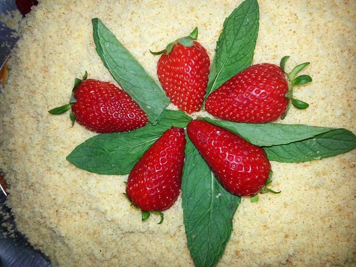 Il secondo pandispagna viene innaffiato da una pioggerella calda di acqua, zucchero, vermout, succo di ananas, e poi farcito di panna montata e frutta a fettine.